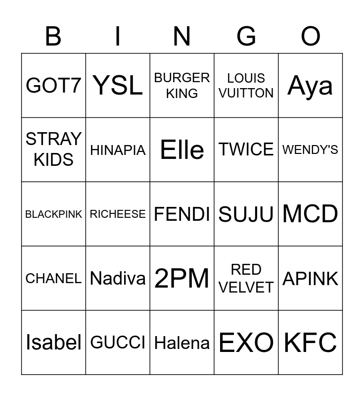 This bingo card has 25 words: Nadiva, Halena, Elle, Isabel, Aya, GOT7, STRAY KIDS, YSL, SUJU, 2PM, TWICE, BLACKPINK, RED VELVET, APINK, HINAPIA, KFC, MCD, BURGER KING, WENDY'S, RICHEESE, FENDI, GUCCI, CHANEL, LOUIS VUITTON and EXO.