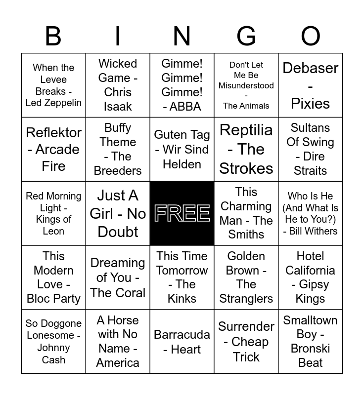 This bingo card has a free space and 81 words: The Man Who Sold the World - David Bowie, The End - The Doors, Gimme! Gimme! Gimme! - ABBA, Come Down - Anderson Paak, In This World - Moby, Just - Radiohead, School - Nirvana, HUMBLE. - Kendrick Lamar, Lonely Boy - The Black Keys, Bulls On Parade - Rage Against The Machine, Last Goodbye - Jeff Buckley, North American Scum - LCD Soundsystem, Don't Let Me Be Misunderstood - The Animals, When the Levee Breaks - Led Zeppelin, Better Living Through Chemistry - Queens of the Stone Age, Reflektor - Arcade Fire, Mister Mental - The Eighties Matchbox B-Line Disaster, Dreaming of You - The Coral, I Wanna Be Adored - The Stone Roses, Who Is He (And What Is He to You?) - Bill Withers, Blister in the Sun - Violent Femmes, Debaser - Pixies, Red Morning Light - Kings of Leon, Guten Tag - Wir Sind Helden, Buffy Theme - The Breeders, White Rabbit - Jefferson Airplane, California Dreamin' - The Mamas & The Papas, So Long, Marianne - Leonard Cohen, Wonderful Tonight - Eric Clapton, I'm Not In Love - 10cc, Sultans Of Swing - Dire Straits, The Passenger - Iggy Pop, Barracuda - Heart, The Hand That Feeds - Nine Inch Nails, So Doggone Lonesome - Johnny Cash, This Charming Man - The Smiths, Running Up That Hill - Kate Bush, White Wedding - Billy Idol, Orinoco Flow - Enya, Smooth Operator - Sade, Smalltown Boy - Bronski Beat, Nothing Compares 2 U - Sinéad O'Connor, Can I Kick It? - A Tribe Called Quest, Are You Gonna Go My Way - Lenny Kravitz, Just A Girl - No Doubt, Believe - Cher, Wicked Game - Chris Isaak, Kiss from a Rose - Seal, Insane in the Brain - Cypress Hill, Fat Lip - Sum 41, Golden Brown - The Stranglers, Hotel California - Gipsy Kings, Ch-Check It Out - Beastie Boys, Strange Overtones - David Byrne, Windowlicker - Aphex Twin, You Keep Me Hangin' On - The Supremes, When They Fight, They Fight - Generationals, The Sound of Silence - Simon & Garfunkel, Shadowplay - Joy Division, Can You Dig It? - The Mock Turtles, This Time Tomorrow - The Kinks, You Never Can Tell - Chuck Berry, Big Log - Robert Plant, Sexual Healing - Marvin Gaye, The Chain - Fleetwood Mac, A Little Less Conversation - Elvis Presley, JXL, Season Of The Witch - Donovan, Holiday in Cambodia - Dead Kennedys, Take Five - Dave Brubeck, Just Like Heaven - The Cure, Hurricane - Bob Dylan, This Modern Love - Bloc Party, A Horse with No Name - America, The Ecstasy Of Gold - Ennio Morricone, Jazzy - Emapea, Brother Love's Travelling Salvation Show - Neil Diamond, Hot Stuff - Donna Summer, Surrender - Cheap Trick, Hocus Pocus - Focus, Reptilia - The Strokes and All is Full of Love - Björk.