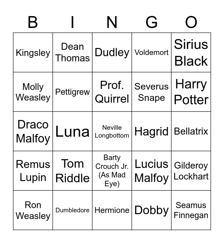 This bingo card has a free space and 29 words: Ron Weasley, Umbridge, Luna, McGonagall, Kingsley, Dudley, Pettigrew, Tom Riddle, Hagrid, Dumbledore, Bellatrix, Seamus Finnegan, Hermione, Dobby, Harry Potter, Arthur Weasley, Barty Crouch Jr. (As Mad Eye), Remus Lupin, Sirius Black, Draco Malfoy, Lucius Malfoy, Narcissa Malfoy, Severus Snape, Molly Weasley, Voldemort, Dean Thomas, Gilderoy Lockhart, Prof. Quirrel and Horace Slughorn.