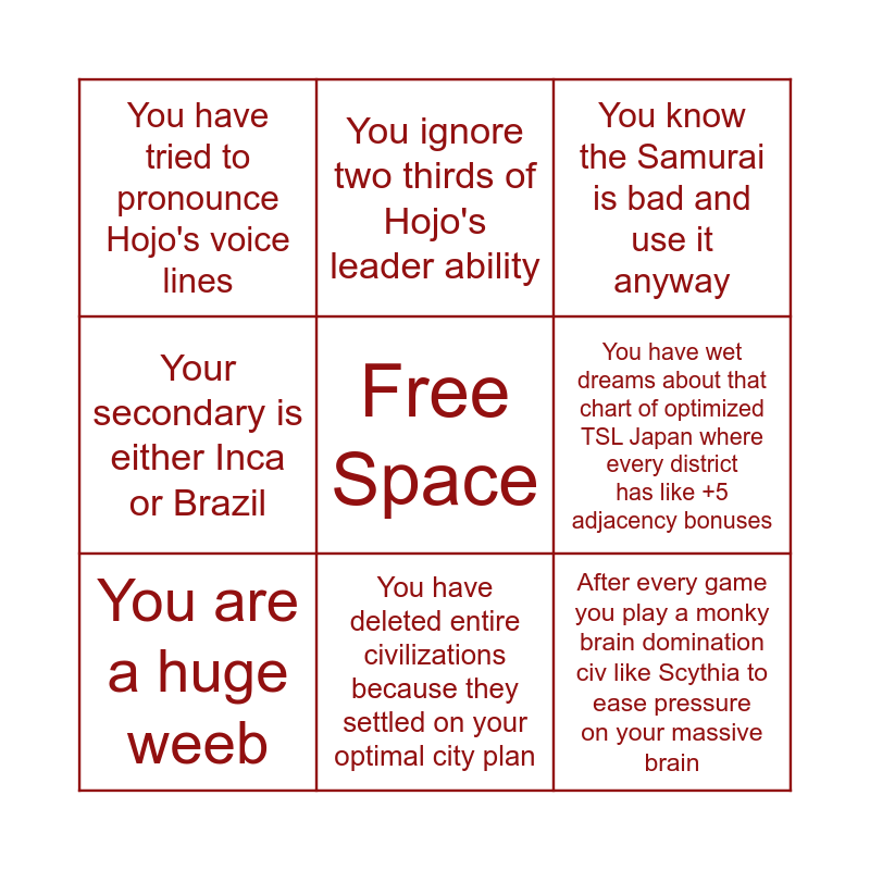This bingo card has a free space and 8 words: You have wet dreams about that chart of optimized TSL Japan where every district has like +5 adjacency bonuses, You know the Samurai is bad and use it anyway, You ignore two thirds of Hojo's leader ability, You are a huge weeb, You have tried to pronounce Hojo's voice lines, After every game you play a monky brain domination civ like Scythia to ease pressure on your massive brain, Your secondary is either Inca or Brazil and You have deleted entire civilizations because they settled on your optimal city plan.