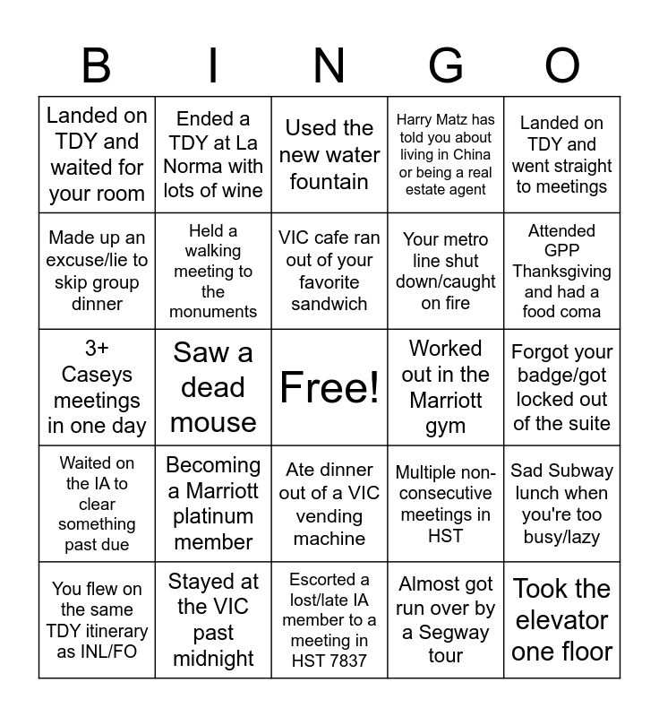This bingo card has a free space and 24 words: Becoming a Marriott platinum member, Stayed at the VIC past midnight, VIC cafe ran out of your favorite sandwich, You flew on the same TDY itinerary as INL/FO, Landed on TDY and went straight to meetings, Landed on TDY and waited for your room, Made up an excuse/lie to skip group dinner, Ended a TDY at La Norma with lots of wine, Worked out in the Marriott gym, Ate dinner out of a VIC vending machine, Your metro line shut down/caught on fire, 3+ Caseys meetings in one day, Multiple non-consecutive meetings in HST, Sad Subway lunch when you're too busy/lazy, Held a walking meeting to the monuments, Almost got run over by a Segway tour, Forgot your badge/got locked out of the suite, Used the new water fountain, Attended GPP Thanksgiving and had a food coma, Saw a dead mouse, Took the elevator one floor, Waited on the IA to clear something past due, Harry Matz has told you about living in China or being a real estate agent and Escorted a lost/late IA member to a meeting in HST 7837.