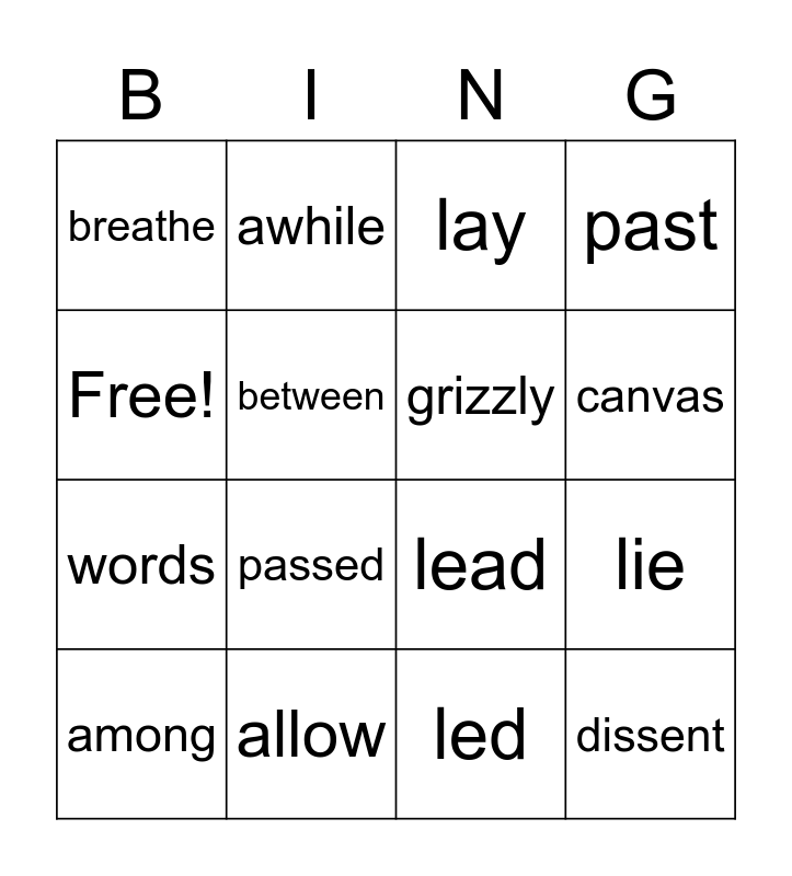 This bingo card has 16 words: allow, lie, lay, breathe, words, awhile, lead, led, Free!, between, among, past, passed, canvas, grizzly and dissent.