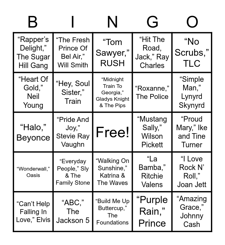 This bingo card has a free space and 50 words: “All Shook Up,” Elvis Presley, “Amazing Grace,” Johnny Cash, “Beautiful Day,” U2, “Build Me Up Buttercup,” The Foundations, “Everyday People,” Sly & The Family Stone, “Family Affair,” Mary J. Blige, “The Fresh Prince Of Bel Air,” Will Smith, “Good Golly Miss Molly,” Little Richard, “Heart Of Gold,” Neil Young, “Hey Ya,” Outkast, “Hey, Soul Sister,” Train, “Hit The Road, Jack,” Ray Charles, “I Love Rock N’ Roll,” Joan Jett, “La Bamba,” Ritchie Valens, “Low Rider,” War, “Material Girl,” Madonna, “Midnight Train To Georgia,” Gladys Knight & The Pips, “Mustang Sally,” Wilson Pickett, “My Girl,” The Temptations, “No Scrubs,” TLC, “Pride And Joy,” Stevie Ray Vaughn, “Purple Rain,” Prince, “Rapper’s Delight,” The Sugar Hill Gang, “Roxanne,” The Police, “Sharp Dressed Man,” ZZ Top, “Shop Around,” Smokey Robinson & The Miracles, “Simple Man,” Lynyrd Skynyrd, “(Sittin’ On) The Dock Of The Bay,” Otis Redding, “Tom Sawyer,” RUSH, “Walking On Sunshine,” Katrina & The Waves, “We Will Rock You,” Queen, “What I Like About You,” The Romantics, “Wild Thing,” The Troggs, “Woolly Bully,” Sam The Sham & The Pharaohs, “ABC,” The Jackson 5, “Ain’t No Mountain High Enough,” Marvin Gaye, “Empire State Of Mind,” Jay-Z feat. Alicia Keys, “Johnny B. Goode,” Chuck Berry, “Lean On Me,” Bill Withers, “Proud Mary,” Ike and Tine Turner, “RESPECT,” Aretha Franklin, Signed, Sealed, Delivered I’m Yours,” Stevie Wonder, “U Got It Bad,” Usher, “All You Need Is Love,” The Beatles, “Can’t Help Falling In Love,” Elvis, “Halo,” Beyonce, “I Will Always Love You,” Whitney Houston, “I’m Yours,” Jason Mraz, “Wonderwall,” Oasis and “Wouldn’t It Be Nice,” The Beach Boys.