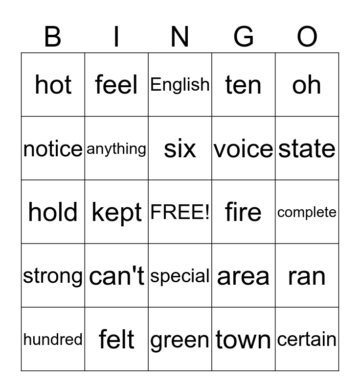 This bingo card has a free space and 36 words: built, ready, list, anything, area, strong, six, rest, oh, full, kept, ten, yes, fire, state, hot, probably, can't, certain, English, complete, ran, felt, hundred, green, feel, hold, person, voice, notice, perhaps, mean, town, special, fast and stood.
