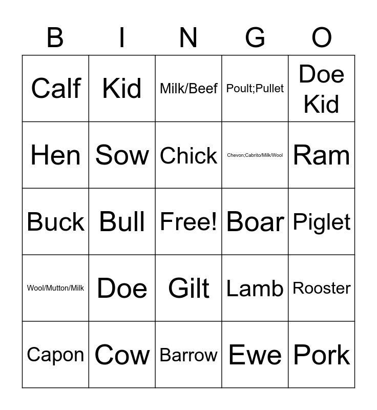 This bingo card has a free space and 30 words: Cow, Heifer, Bull, Steer, Calf, Milk/Beef, Sow, Gilt, Boar, Barrow, Piglet, Pork, Ewe, Ewe Lamb, Ram, Wether (sheep), Lamb, Wool/Mutton/Milk, Doe, Doe Kid, Buck, Wether (goat), Kid, Chevon;Cabrito/Milk/Wool, Hen, Poult;Pullet, Rooster, Capon, Chick and Meat/Eggs.