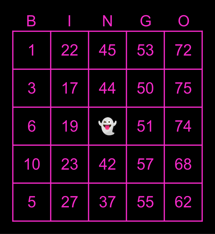This bingo card has a free space and 24 words: 5, 23, 44, 55, 72, 1, 22, 45, 51, 74, 6, 17, 57, 68, 3, 27, 37, 53, 75, 10, 19, 42, 50 and 62.