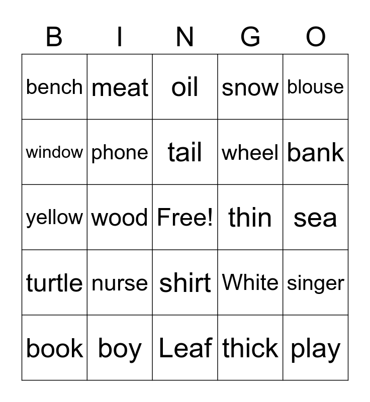 This bingo card has a free space and 31 words: Leaf, train, wood, house, bench, oil, phone, White, thin, thick, sea, play, send, wink, bank, teacher, singer, nurse, turtle, shirt, blouse, mouse, book, meat, wheel, window, snow, yellow, boy, tail and cow.