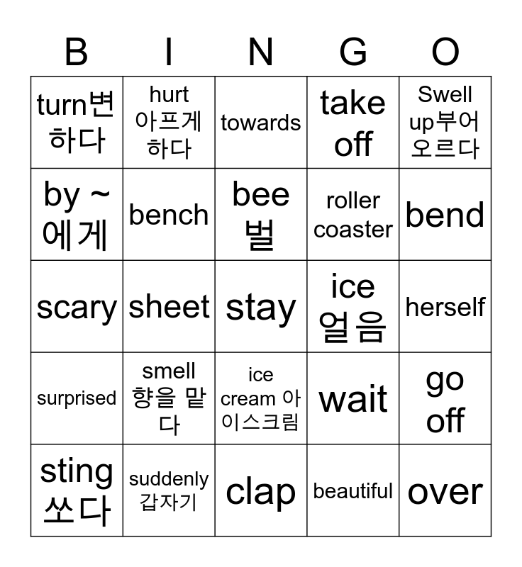 This bingo card has a free space and 24 words: smell 향을 맡다, suddenly 갑자기, bee 벌, sting 쏘다, Swell up부어오르다, turn변하다, by ~에게, hurt 아프게하다, ice 얼음, ice cream 아이스크림, roller coaster, scary, wait, go off, bench, beautiful, herself, towards, bend, sheet, over, surprised, take off and clap.
