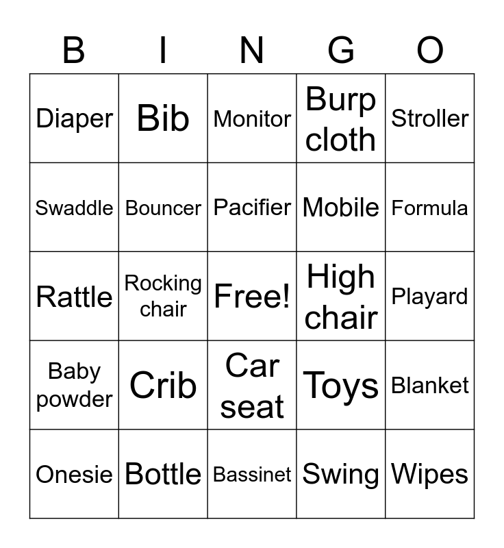 This bingo card has a free space and 24 words: Crib, Bottle, Pacifier, Onesie, Stroller, Diaper, Swaddle, Bib, High chair, Car seat, Mobile, Rattle, Toys, Blanket, Bouncer, Swing, Playard, Monitor, Formula, Rocking chair, Wipes, Baby powder, Burp cloth and Bassinet.