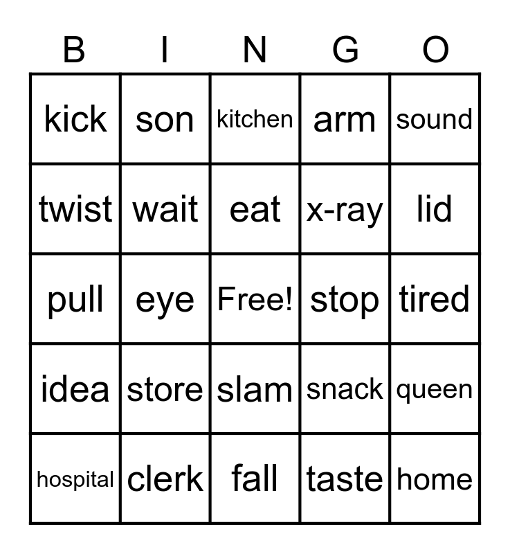 This bingo card has a free space and 55 words: ball, hospital, doctor, kick, fall, down, wait, hurt, x-ray, picture, arm, soccer, show, sign, broken, candy, sound, eye, teeth, home, stop, drop, snack, kitchen, exercise, eat, taste, want, tired, queen, zipper, fox, tug, zip, twist, pull, dress, idea, hurry, tight, son, hair, loss, wig, store, clerk, buy, bring, trash can, lid, try on, throw, quit, slam and perfect.