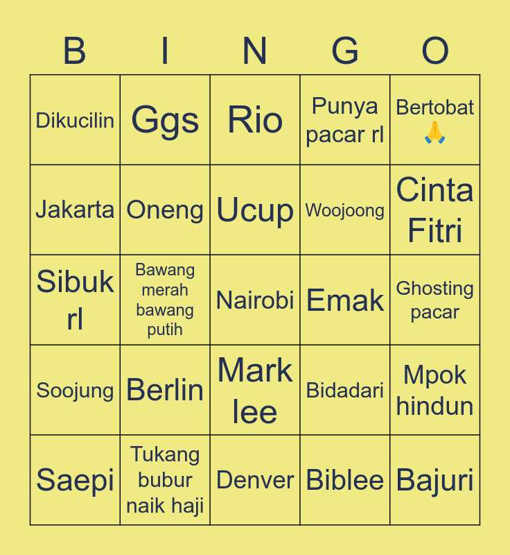 This bingo card has a free space and 24 words: Berlin, Tukang bubur naik haji, Ucup, Saepi, Bertobat🙏, Dikucilin, Jakarta, Ggs, Emak, Mark lee, Woojoong, Sibuk rl, Bidadari, Mpok hindun, Oneng, Biblee, Ghosting pacar, Rio, Cinta Fitri, Bawang merah bawang putih, Bajuri, Soojung, Punya pacar rl and Denver.