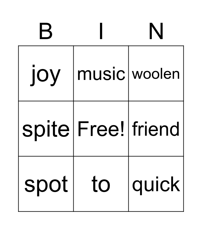 This bingo card has a free space and 20 words: spoon, paint, woolen, green, care, quick, life, joy, measure, music, other, sick, friend, thank, spot, mad, to, spite, end and refresh.