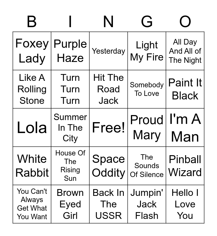 This bingo card has a free space and 50 words: My Generation, Hello I Love You, Hey Jude, Back In The USSR, House Of The Rising Sun, Evil Ways, Purple Haze, California Dreamin', Like A Rolling Stone, Suite Judy Blue Eyes, Turn Turn Turn, Light My Fire, Pinball Wizard, The Sounds Of Silence, Good Lovin', The Twist, Hit The Road Jack, Proud Mary, Dazed & Confused, All Day And All of The Night, Summer In The City, Jumpin' Jack Flash, Foxey Lady, Somebody To Love, Time Has Come Today, Do You Believe In magic, Paint It Black, Good Vibrations, Yesterday, Space Oddity, The Weight, Revolution, I Fought The Law, The Times They Are A Changin, Brown Eyed Girl, Touch Me, Surf City, Mr. Tambourine Man, Blowin' In The Wind, I'm A Man, Itchycoo Park, 96 Tears, Wipe Out, I Put A Spell On You, You Can't Always Get What You Want, Lola, Break On Through ( To The Other Side), The Letter, White Rabbit and She's Not There.