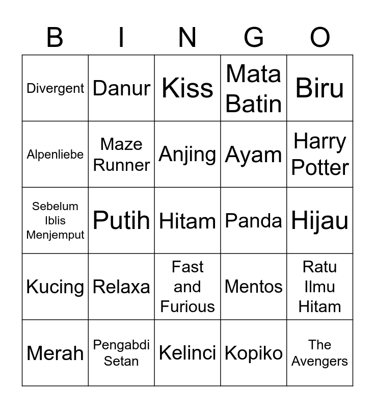This bingo card has a free space and 24 words: Relaxa, Pengabdi Setan, Anjing, Merah, Biru, Divergent, Alpenliebe, Danur, Panda, Fast and Furious, Ayam, Sebelum Iblis Menjemput, Mentos, Ratu Ilmu Hitam, Maze Runner, Kopiko, Hijau, Kiss, Harry Potter, Putih, The Avengers, Kucing, Mata Batin and Kelinci.