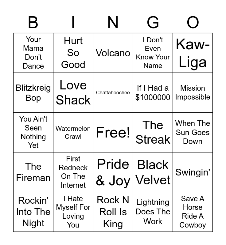 This bingo card has a free space and 40 words: Drift Away, You Ain't Seen Nothing Yet, Takin' Care Of Business, Love Shack, I Hate Myself For Loving You, Pride & Joy, Chattahoochee, American Made, Kaw-Liga, The Fireman, Watermelon Crawl, I Don't Even Know Your Name, Save A Horse Ride A Cowboy, When The Sun Goes Down, The Streak, First Redneck On The Internet, I Think I Love you, Your Mama Don't Dance, Hard To handle, Volcano, Swingin', Lightning Does The Work, If I Had a $1000000, Blitzkreig Bop, Purple Rain, You Make My Dreams Come True, What A Feeling, Cotton Eye Joe, Walk The Dinosaur, Another One Bites The Dust, Lovin' Touchin' Squeezin', Rockin' Into The Night, Your Love, Black Velvet, Mission Impossible, Rock N Roll Is King, Expressway To Your Heart, Riot In Cell Block #9, Hurt So Good and Squeeze Box.