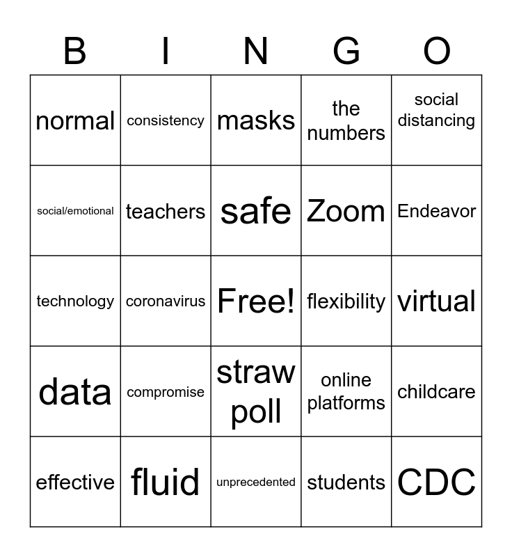 This bingo card has a free space and 24 words: compromise, fluid, safe, effective, social distancing, normal, social/emotional, consistency, flexibility, straw poll, Zoom, technology, online platforms, childcare, teachers, students, virtual, masks, Endeavor, coronavirus, CDC, data, the numbers and unprecedented.