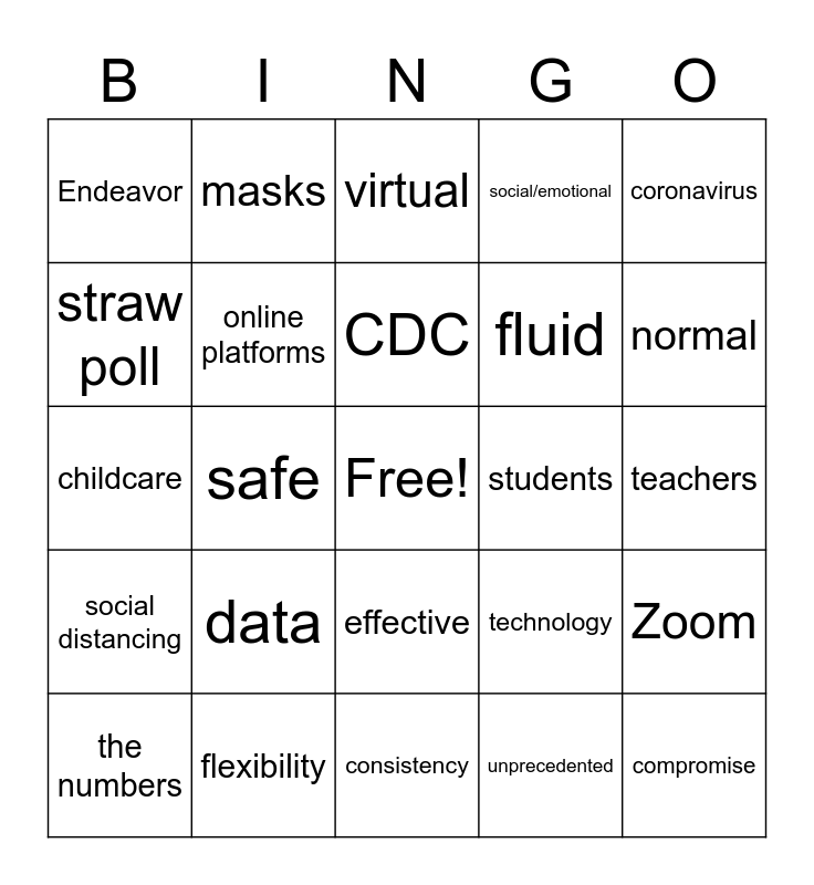 This bingo card has a free space and 24 words: the numbers, data, CDC, unprecedented, coronavirus, Endeavor, masks, virtual, students, teachers, childcare, online platforms, technology, Zoom, straw poll, flexibility, consistency, social/emotional, normal, social distancing, safe, effective, fluid and compromise.