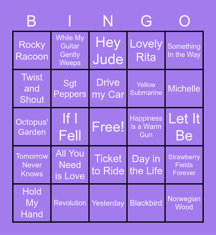 This bingo card has a free space and 24 words: All You Need is Love, Revolution, Drive my Car, Hold My Hand, Something In the Way, Rocky Racoon, Twist and Shout, While My Guitar Gently Weeps, Happiness is a Warm Gun, Ticket to Ride, Yellow Submarine, Octopus' Garden, Day in the Life, Strawberry Fields Forever, Sgt Peppers, Blackbird, Let It Be, Hey Jude, Michelle, If I Fell, Norwegian Wood, Tomorrow Never Knows, Lovely Rita and Yesterday.