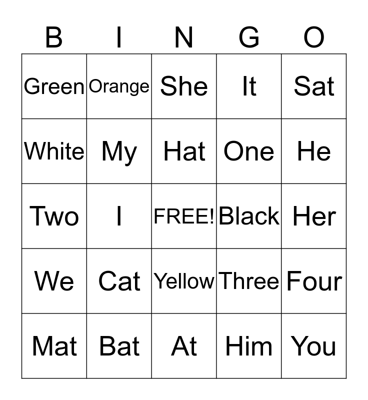 This bingo card has a free space and 24 words: Cat, Bat, Hat, Mat, Sat, Green, White, Orange, Black, Yellow, One, Two, Three, Four, My, Him, Her, She, He, I, You, We, It and At.