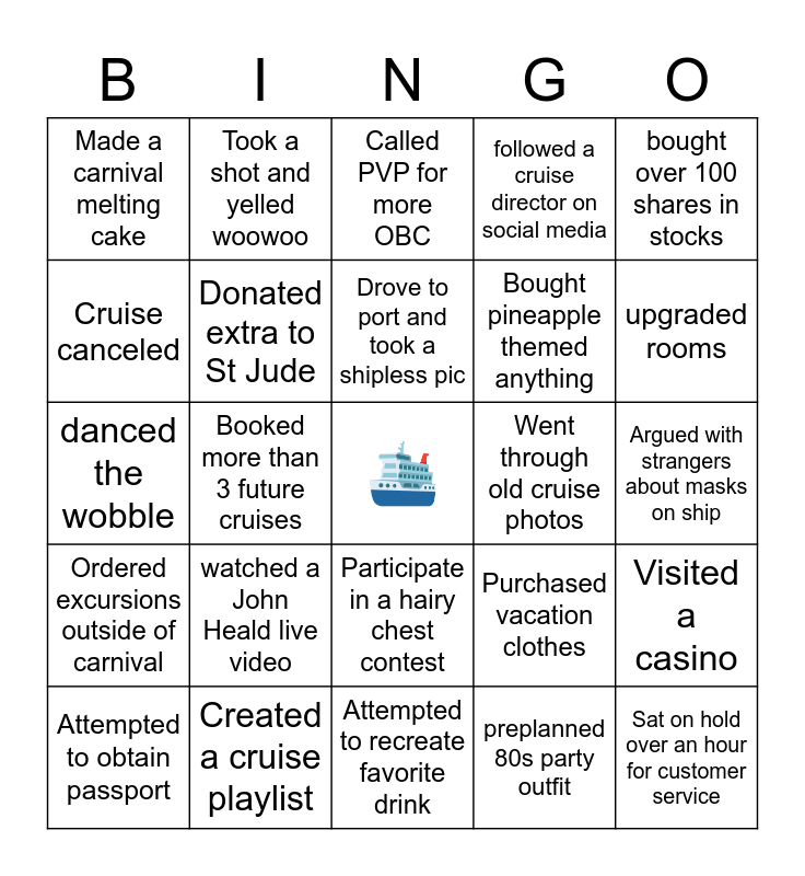 This bingo card has a free space and 24 words: watched a John Heald live video, Created a cruise playlist, Drove to port and took a shipless pic, Attempted to obtain passport, bought over 100 shares in stocks, Made a carnival melting cake, Cruise canceled, Took a shot and yelled woowoo, Went through old cruise photos, Participate in a hairy chest contest, Bought pineapple themed anything, danced the wobble, Purchased vacation clothes, Visited a casino, Donated extra to St Jude, preplanned 80s party outfit, Argued with strangers about masks on ship, Called PVP for more OBC, upgraded rooms, Booked more than 3 future cruises, Sat on hold over an hour for customer service, Ordered excursions outside of carnival, followed a cruise director on social media and Attempted to recreate favorite drink.