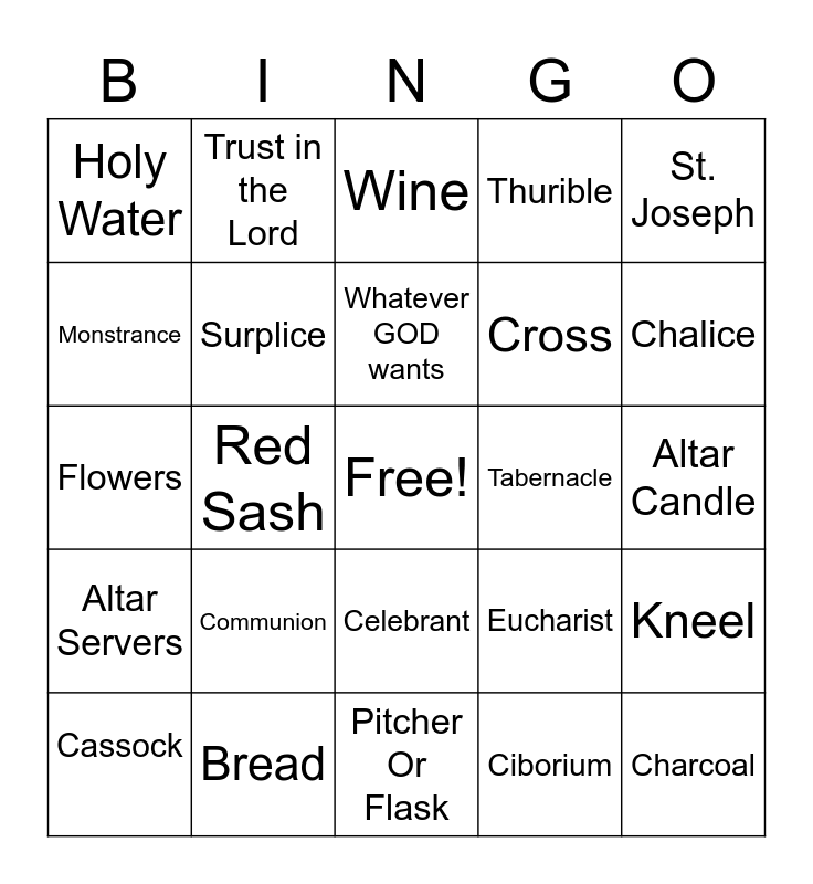 This bingo card has a free space and 39 words: Bells, Incense, Vests, Surplice, Cassock, Celebrant, Whatever GOD wants, Deacons, St. Joseph, Altar Servers, Red Sash, Thurible, Charcoal, Altar Candle, Tabernacle, Communion, Paten, Holy Water, Purple Sash, Eucharist, Monstrance, Pitcher Or Flask, Cross, Chalice, Our Father Prayer, Confession, Mass, Priest, Phil. 4:13, Trust in the Lord, Gospel, Cruets, Wine, Bread, Ciborium, Ambo, Kneel, Flowers and Recognition Mass.