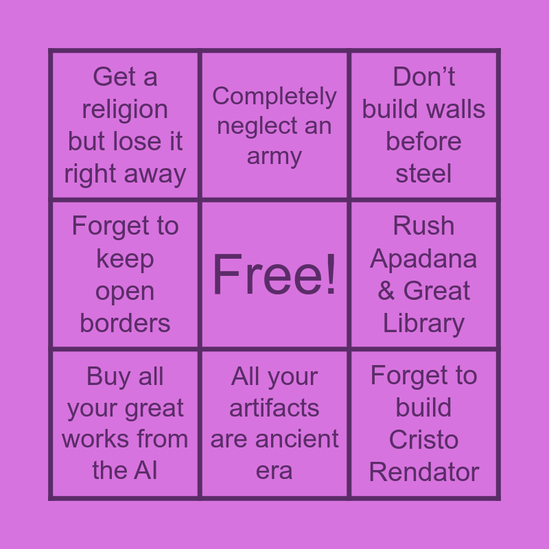 This bingo card has a free space and 8 words: Rush Apadana & Great Library, Don’t build walls before steel, Completely neglect an army, Buy all your great works from the AI, Get a religion but lose it right away, Forget to build Cristo Rendator, Forget to keep open borders and All your artifacts are ancient era.