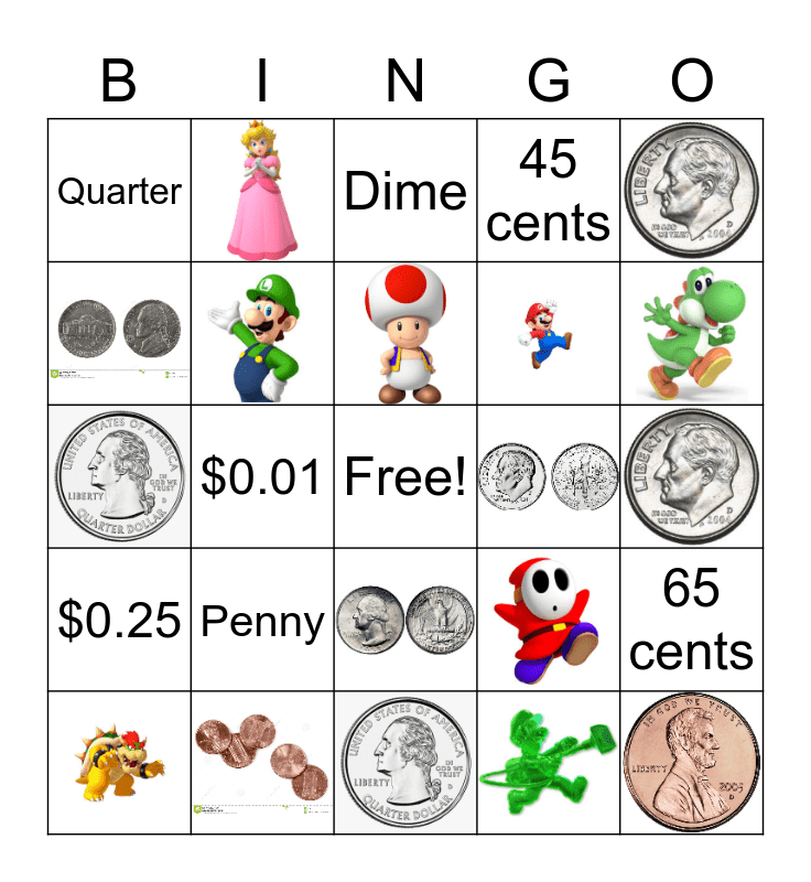 This bingo card has 19 images, a free space and 10 words: $0.10, $0.01, Quarter, Dime, Penny, $0.05, $0.25, 45 cents, 65 cents and $1.00.