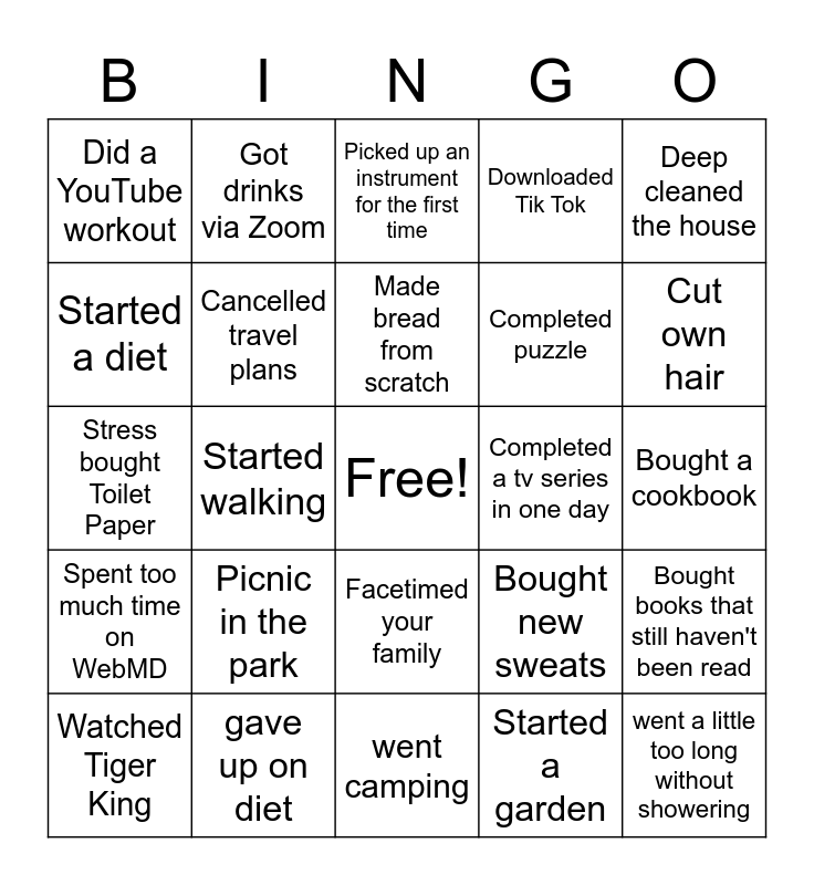 This bingo card has a free space and 24 words: Watched Tiger King, Picnic in the park, Made bread from scratch, Started a garden, Deep cleaned the house, Did a YouTube workout, Got drinks via Zoom, Picked up an instrument for the first time, Completed a tv series in one day, Bought a cookbook, Stress bought Toilet Paper, Cancelled travel plans, Bought new sweats, Bought books that still haven't been read, Started a diet, gave up on diet, went camping, Downloaded Tik Tok, Cut own hair, Spent too much time on WebMD, Started walking, Facetimed your family, Completed puzzle and went a little too long without showering.