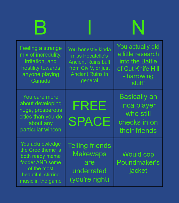 This bingo card has a free space and 8 words: You care more about developing huge, prosperous cities than you do about any particular wincon, You honestly kinda miss Pocatello's Ancient Ruins buff from Civ V, or just Ancient Ruins in general, Basically an Inca player who still checks in on their friends, You acknowledge the Cree theme is both ready meme fodder AND some of the most beautiful, stirring music in the game, You actually did a little research into the Battle of Cut Knife Hill - harrowing stuff!, Feeling a strange mix of incredulity, irritation, and hostility towards anyone playing Canada, Telling friends Mekewaps are underrated (you're right) and Would cop Poundmaker's jacket.