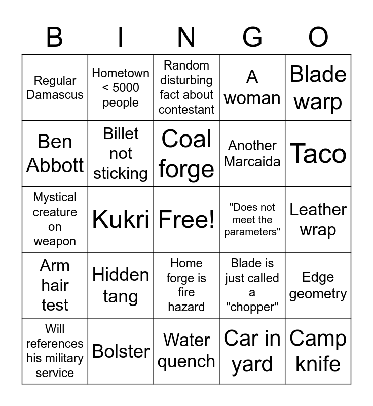 This bingo card has a free space and 57 words: Sanmai, Will references his military service, Canister Damascus, Regular Damascus, Water quench, Burn through, Billet not sticking, Someone's mom has a crush on Doug, Another Marcaida, Will calls someone "brother", A woman, A non white person who is not a Marcaida, Too much flux, Forge is a former barn, Self proclaimed underdog, Video game reference, Blade warp, Kukri, Bowie, Camp knife, "Does not meet the parameters", Catastrophic blade failure, Blade is just called a "chopper", Random disturbing fact about contestant, Someone prefers the "old fashioned way", Coal forge, Twist, Dummy disemboweled, Taco, Ricasso, Fuller, Vaguely racist cartoon simulation, Kilt (contestant), Kilt (judge), Leather wrap, Ben Abbott, Contestant has to start over, Mystical creature on weapon, Runes, Arm hair test, Hometown < 5000 people, Home forge is fire hazard, Out of propane, "ABS master bladesmith", Anthropomorphized weapon, "It was a pleasure to watch you work", Hidden tang, Bolster, Long beard, Soul patch, Farm animal, Car in yard, Quench ping, Fruit test, "It's not about what your blade does to...", Edge geometry and "Right, tight, and true".