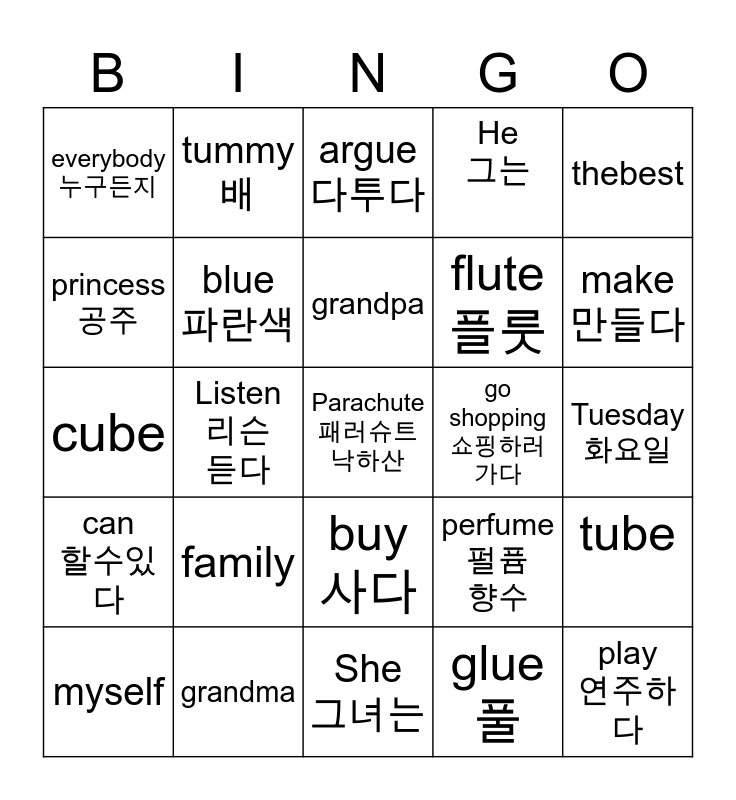 This bingo card has a free space and 24 words: family, grandma, grandpa, myself, thebest, everybody 누구든지, princess 공주, tummy 배, go shopping 쇼핑하러가다, buy 사다, flute플룻, cube, perfume 펄퓸 향수, tube, blue 파란색, glue 풀, Tuesday화요일, argue 다투다, make 만들다, Listen 리슨 듣다, play 연주하다, can 할수있다, He 그는 and She 그녀는.