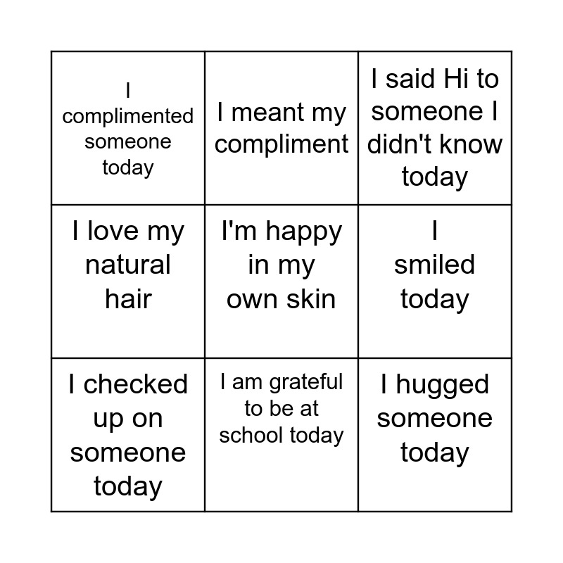 This bingo card has a free space and 8 words: I smiled today, I said Hi to someone I didn't know today, I meant my compliment, I checked up on someone today, I complimented someone today, I hugged someone today, I love my natural hair and I am grateful to be at school today.