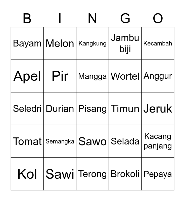 This bingo card has a free space and 24 words: Semangka, Sawi, Mangga, Kol, Kecambah, Bayam, Apel, Melon, Timun, Sawo, Wortel, Seledri, Selada, Kacang panjang, Pir, Brokoli, Jeruk, Kangkung, Anggur, Durian, Pepaya, Tomat, Jambu biji and Terong.