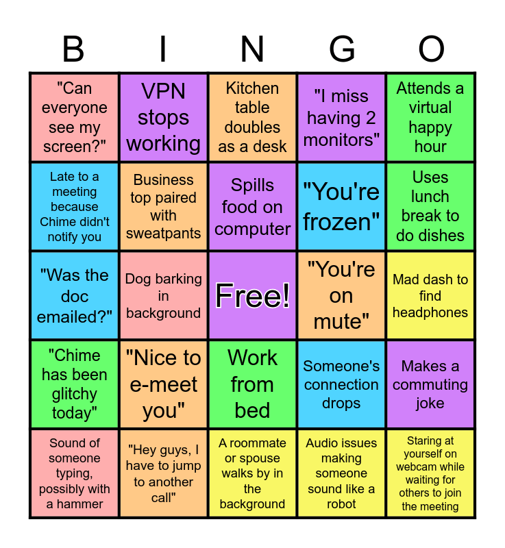 This bingo card has a free space and 29 words: Sound of someone typing, possibly with a hammer, Loud, painful echo/ feedback, Dog barking in background, "Can we take this offline?", "Can everyone see my screen?", Kitchen table doubles as a desk, Business top paired with sweatpants, "Nice to e-meet you", "You're on mute", "Hey guys, I have to jump to another call", Mad dash to find headphones, Staring at yourself on webcam while waiting for others to join the meeting, A roommate or spouse walks by in the background, Audio issues making someone sound like a robot, Uses lunch break to do dishes, Alexa thinks you are talking to her, Work from bed, "Chime has been glitchy today", Attends a virtual happy hour, "Was the doc emailed?", Someone's connection drops, Child enters the room, "You're frozen", Late to a meeting because Chime didn't notify you, "I miss having 2 monitors", VPN stops working, Makes a commuting joke, Spills food on computer and Accidentally presses security key in a Chime conversation.