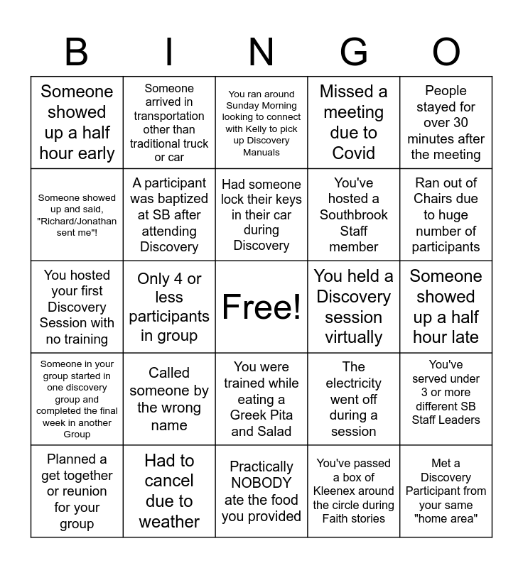 This bingo card has a free space and 24 words: Called someone by the wrong name, Had to cancel due to weather, Had someone lock their keys in their car during Discovery, Planned a get together or reunion for your group, People stayed for over 30 minutes after the meeting, Someone showed up a half hour early, Someone showed up and said, "Richard/Jonathan sent me"!, Someone arrived in transportation other than traditional truck or car, You held a Discovery session virtually, You were trained while eating a Greek Pita and Salad, You've hosted a Southbrook Staff member, You hosted your first Discovery Session with no training, The electricity went off during a session, You've served under 3 or more different SB Staff Leaders, A participant was baptized at SB after attending Discovery, You've passed a box of Kleenex around the circle during Faith stories, Someone showed up a half hour late, You ran around Sunday Morning looking to connect with Kelly to pick up Discovery Manuals, Ran out of Chairs due to huge number of participants, Only 4 or less participants in group, Met a Discovery Participant from your same "home area", Someone in your group started in one discovery group and completed the final week in another Group, Missed a meeting due to Covid and Practically NOBODY ate the food you provided.
