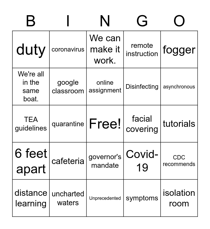 This bingo card has a free space and 27 words: Covid-19, Social Distancing, Disinfecting, Unprecedented, We're all in the same boat., We can make it work., coronavirus, 6 feet apart, facial covering, CDC recommends, TEA guidelines, remote instruction, distance learning, uncharted waters, asynchronous, learning management platform, google classroom, online assignment, cafeteria, duty, tutorials, symptoms, quarantine, isolation room, governor's mandate, fogger and contact tracing.