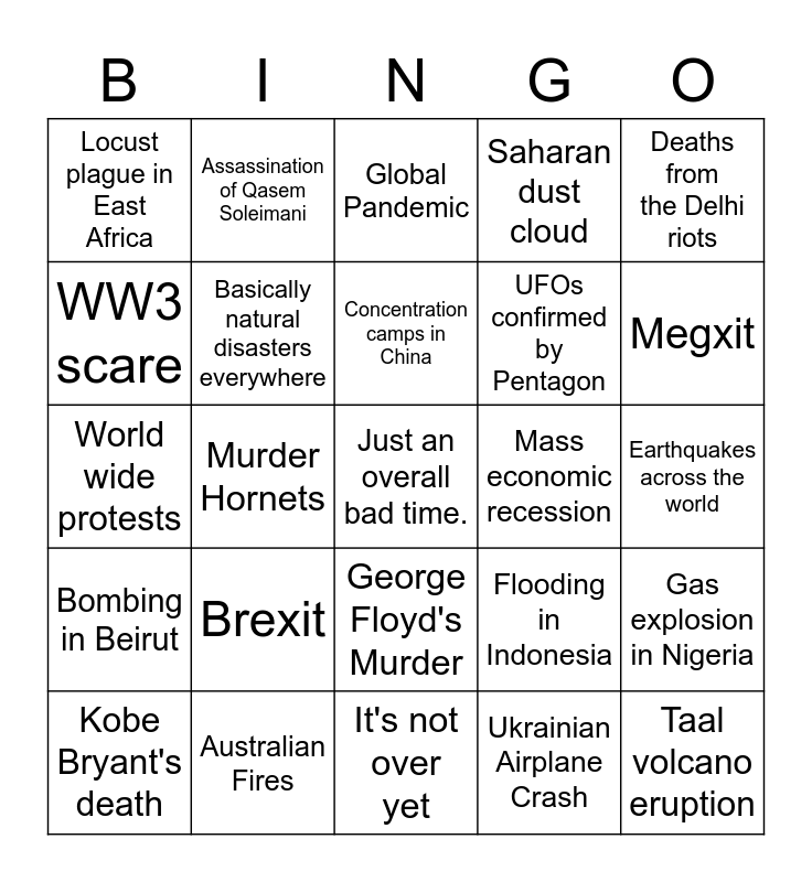 This bingo card has a free space and 24 words: Brexit, Australian Fires, Concentration camps in China, Kobe Bryant's death, Deaths from the Delhi riots, Locust plague in East Africa, WW3 scare, Assassination of Qasem Soleimani, Mass economic recession, George Floyd's Murder, UFOs confirmed by Pentagon, World wide protests, Flooding in Indonesia, Gas explosion in Nigeria, Basically natural disasters everywhere, Ukrainian Airplane Crash, Earthquakes across the world, Global Pandemic, Megxit, Murder Hornets, Taal volcano eruption, Bombing in Beirut, Saharan dust cloud and It's not over yet.