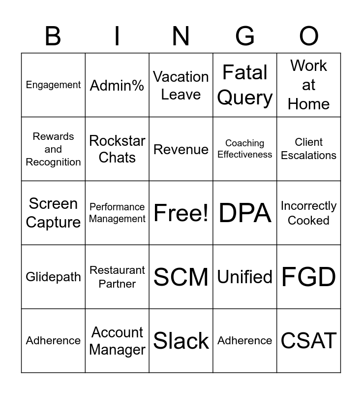 This bingo card has a free space and 43 words: Efficiency, CSAT, Alina, Adherence, Lost Hours, Adherence, Vacation Leave, LWOP, Work at Home, Account Manager, Fatal Query, DPA, SCM, Restaurant Partner, Order Cancellation, Slack, OneTeam, Screen Capture, 24 Hr Callback, Client Escalations, Admin%, Attrition, Graduation rate, Engagement, Deflected Tickets, Incorrectly Cooked, Allergen, Delco, Unified, Glidepath, Compliance, FGD, Outlier Agents, Performance Management, P4P, Incentives, HPP, Revenue, Rewards and Recognition, Coaching Effectiveness, Coffee House Sessions, Rockstar Chats and Hold Time.