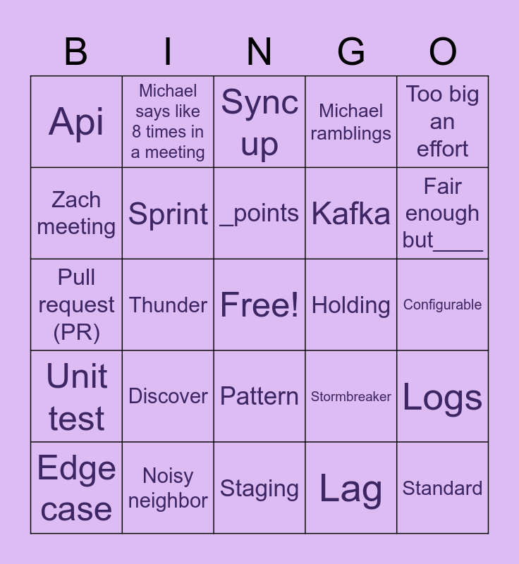 This bingo card has a free space and 29 words: Edge case, Cucumber, Thunder, Production, Api, Sync up, Sprint, Discover, Holding, Noisy neighbor, Configurable, Standard, Staging, Lag, Fair enough but____, Lightning, Pattern, Unit test, Too big an effort, Pull request (PR), Stormbreaker, Blocker, Kafka, Zach meeting, Michael ramblings, Michael says like 8 times in a meeting, Logs, _points and Fist to five.