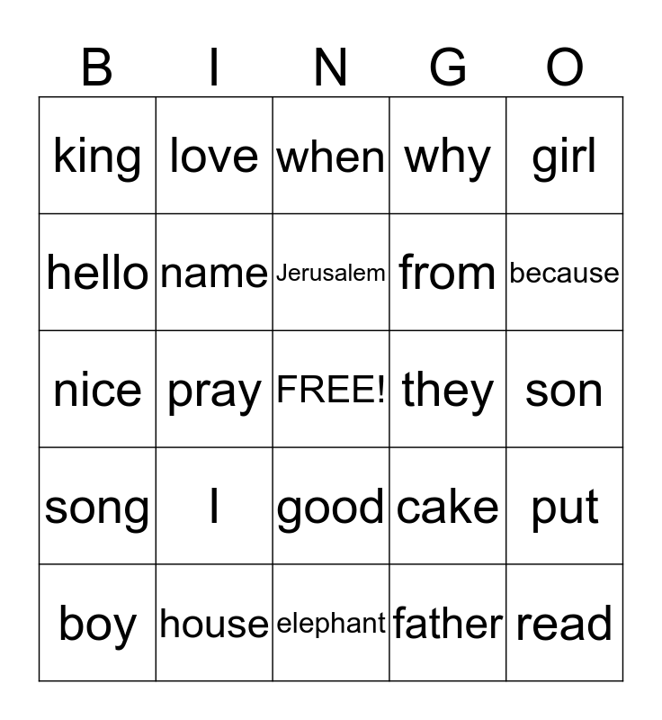 This bingo card has a free space and 24 words: I, house, Jerusalem, boy, girl, king, hello, love, they, good, from, nice, cake, put, name, father, son, when, because, pray, read, song, why and elephant.