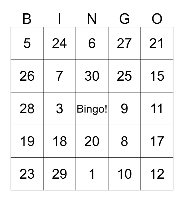 This bingo card has a free space and 31 words: 1, 2, 3, 4, 5, 6, 7, 8, 9, 10, 11, 12, 13, 14, 15, 16, 17, 18, 19, 20, 21, 22, 23, 24, 25, 26, 27, 28, 29, 30 and 31.
