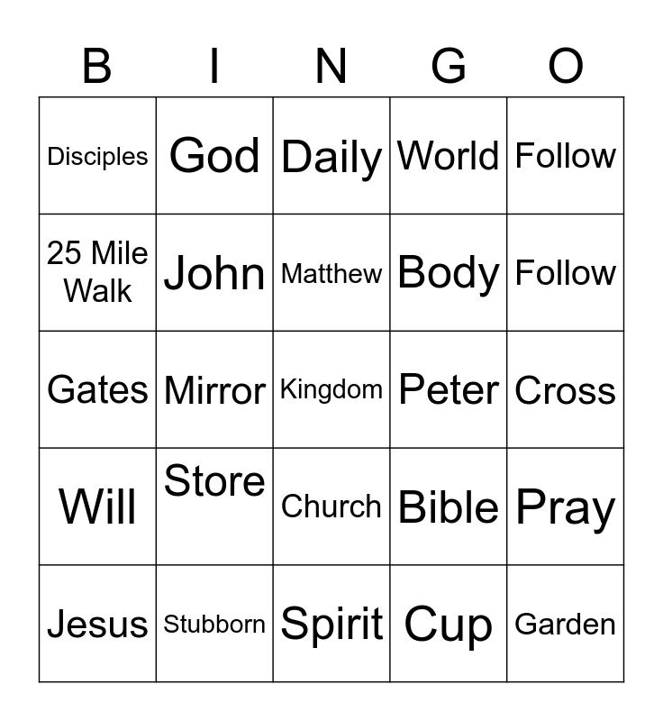 This bingo card has a free space and 24 words: Store, Stubborn, Matthew, Jesus, Follow, Disciples, 25 Mile Walk, God, Peter, Church, Body, Gates, Bible, Pray, John, Cup, Cross, Daily, Follow, Mirror, Garden, Will, World and Spirit.