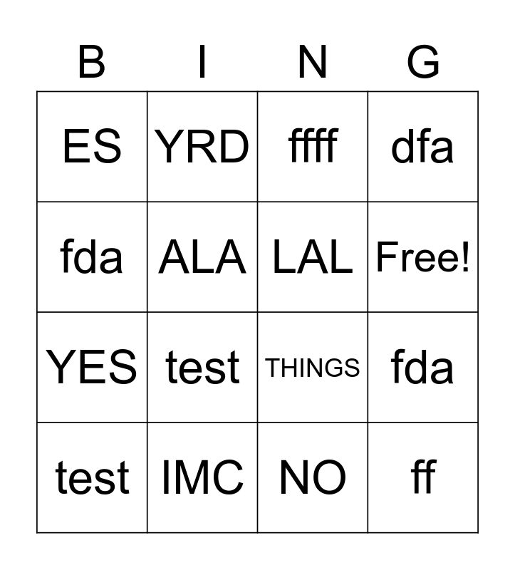 This bingo card has 18 words: test, ff, ffff, ES, THINGS, dfa, test, YRD, Free!, YES, NO, fda, fda, ALA, LAL, LAL, IMC and IMC2.