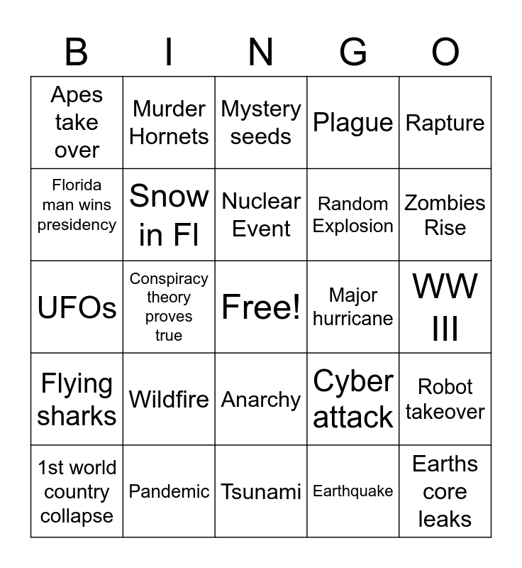 This bingo card has a free space and 24 words: Wildfire, Pandemic, Nuclear Event, 1st world country collapse, Rapture, Apes take over, Florida man wins presidency, Murder Hornets, Major hurricane, Anarchy, Random Explosion, UFOs, Cyber attack, Robot takeover, Snow in Fl, Earthquake, WW III, Mystery seeds, Zombies Rise, Conspiracy theory proves true, Earths core leaks, Flying sharks, Plague and Tsunami.