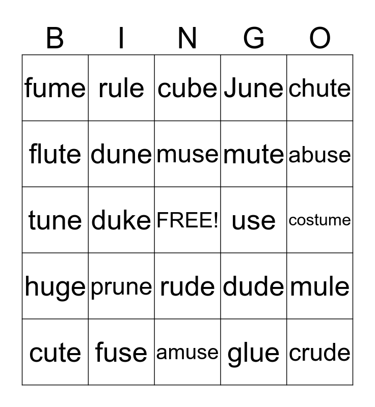 This bingo card has a free space and 28 words: mule, tube, mute, glue, flute, cube, rule, huge, use, cute, tune, June, fuse, amuse, abuse, clue, prune, dune, muse, rude, fume, spruce, crude, duke, costume, dude, chute and truce.