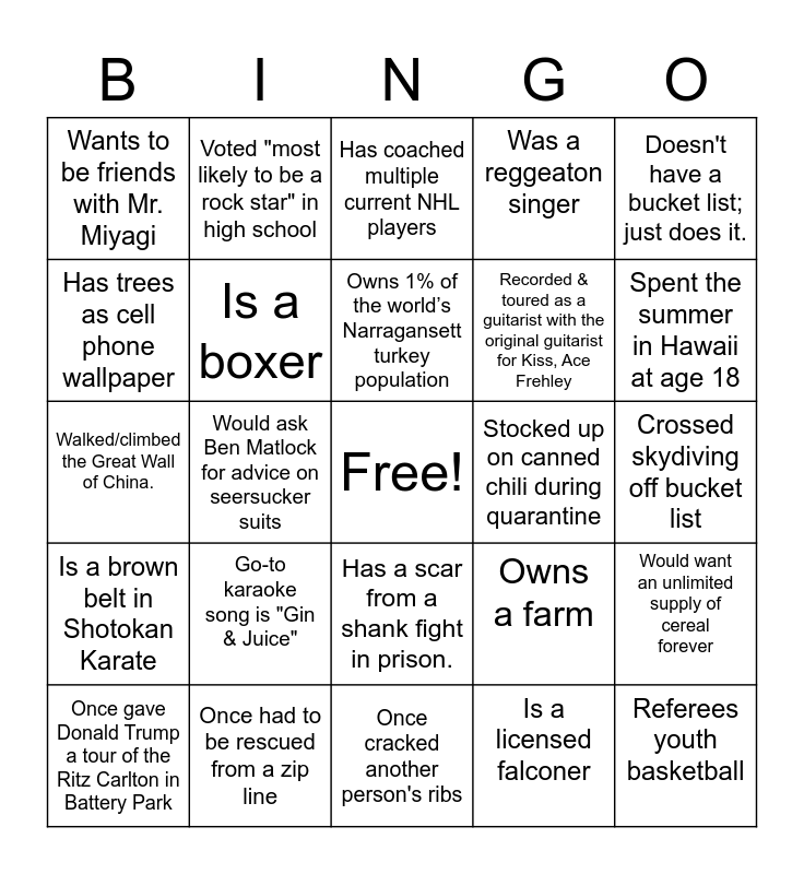 This bingo card has a free space and 24 words: Go-to karaoke song is "Gin & Juice", Once had to be rescued from a zip line, Owns 1% of the world’s Narragansett turkey population, Once gave Donald Trump a tour of the Ritz Carlton in Battery Park, Doesn't have a bucket list; just does it., Wants to be friends with Mr. Miyagi, Has trees as cell phone wallpaper, Voted "most likely to be a rock star" in high school, Stocked up on canned chili during quarantine, Has a scar from a shank fight in prison., Recorded & toured as a guitarist with the original guitarist for Kiss, Ace Frehley, Walked/climbed the Great Wall of China., Owns a farm, Would want an unlimited supply of cereal forever, Is a boxer, Is a licensed falconer, Crossed skydiving off bucket list, Has coached multiple current NHL players, Spent the summer in Hawaii at age 18, Would ask Ben Matlock for advice on seersucker suits, Referees youth basketball, Is a brown belt in Shotokan Karate, Was a reggeaton singer and Once cracked another person's ribs.