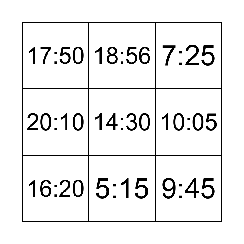 This bingo card has 9 words: 16:20, 7:25, 18:56, 20:10, 17:50, 10:05, 14:30, 9:45 and 5:15.