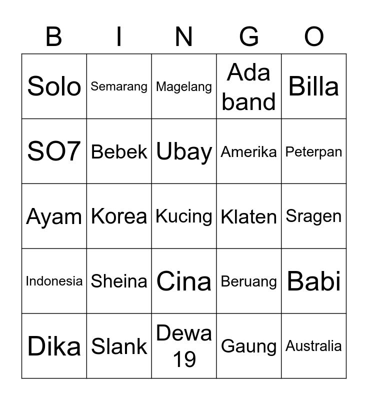 This bingo card has a free space and 24 words: Dika, Sheina, Ubay, Gaung, Billa, Solo, Semarang, Magelang, Klaten, Sragen, Ayam, Bebek, Beruang, Babi, SO7, Slank, Dewa 19, Ada band, Peterpan, Indonesia, Korea, Cina, Amerika and Australia.