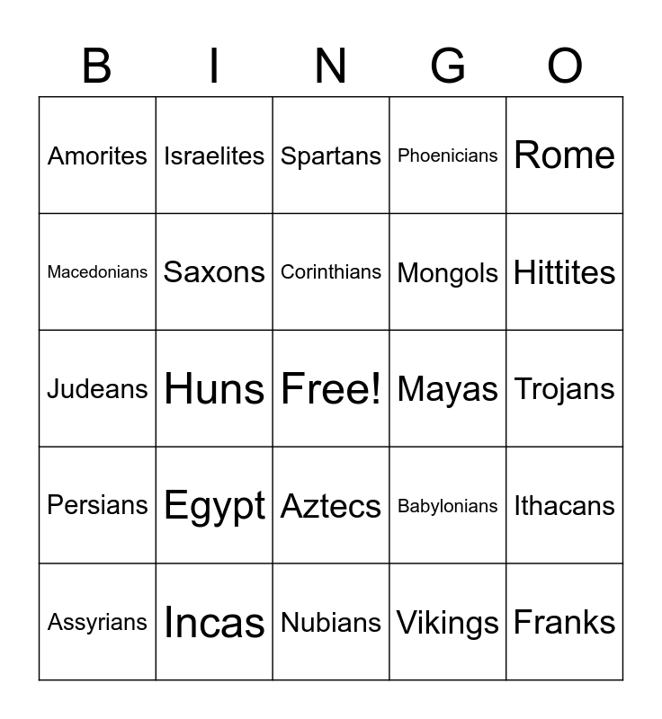 This bingo card has a free space and 24 words: Egypt, Incas, Corinthians, Assyrians, Rome, Amorites, Macedonians, Israelites, Mayas, Aztecs, Mongols, Judeans, Babylonians, Ithacans, Saxons, Vikings, Trojans, Spartans, Hittites, Huns, Franks, Persians, Phoenicians and Nubians.