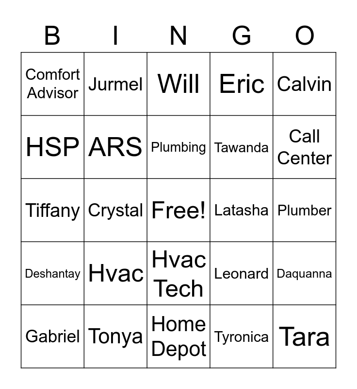 This bingo card has a free space and 24 words: Hvac, Tonya, Plumbing, Gabriel, Calvin, Comfort Advisor, HSP, Jurmel, Latasha, Hvac Tech, Tawanda, Tiffany, Leonard, Daquanna, ARS, Tyronica, Plumber, Will, Call Center, Crystal, Tara, Deshantay, Eric and Home Depot.